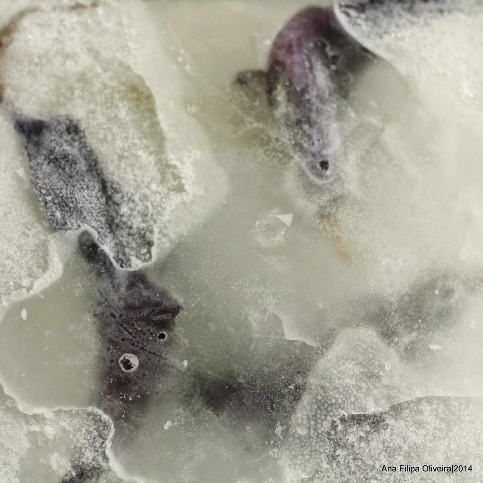 Tenho a dizer que o primeiro contacto com esta técnica deixou-me desiludida. Utilizei três flores que congelei - não por etapas - numa embalagem de plástico quadrada, o que se mostrou problemático para fotografar, pois, devido a não ter uma macro-objectiva, tive dificuldade em fotografar a área, que demonstrou ser demasiadamente pequena. Por outro lado, escolhi flores com pétalas escuras, o que deu um aspecto mais melancólico, ou natureza morta, às fotografias.